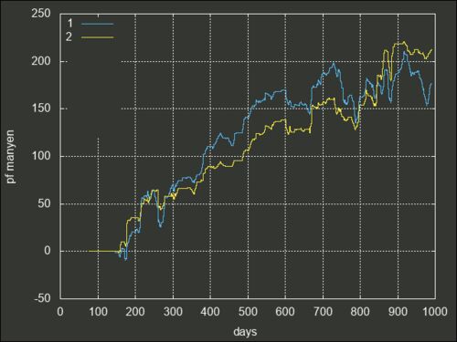 長ったらしい題名ですが・・・ 自作システムは一応GUIなので、バックテストは こんなパネル上で、ルールを選んで、操作ボタンを押してグラフを出力させるんですが ストラテジーがテキストファイルであり かつ、ほぼすべての操作がコマンドである ので m4r2=0…